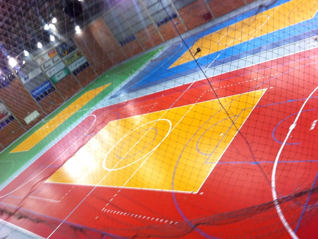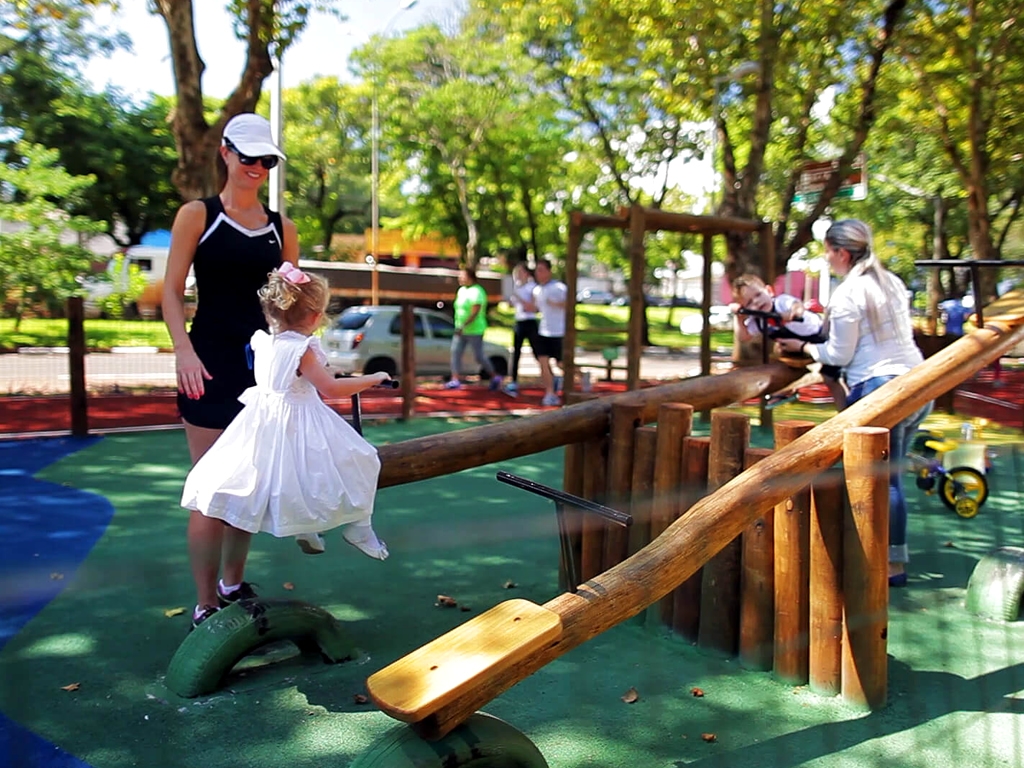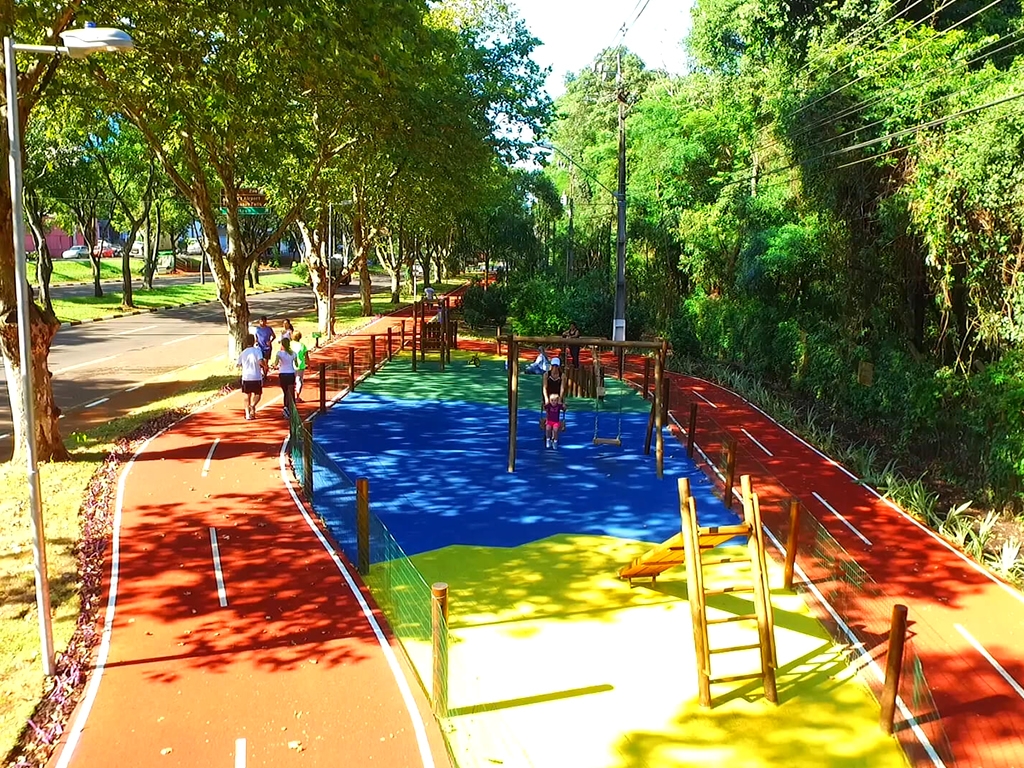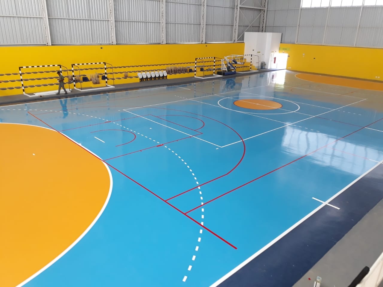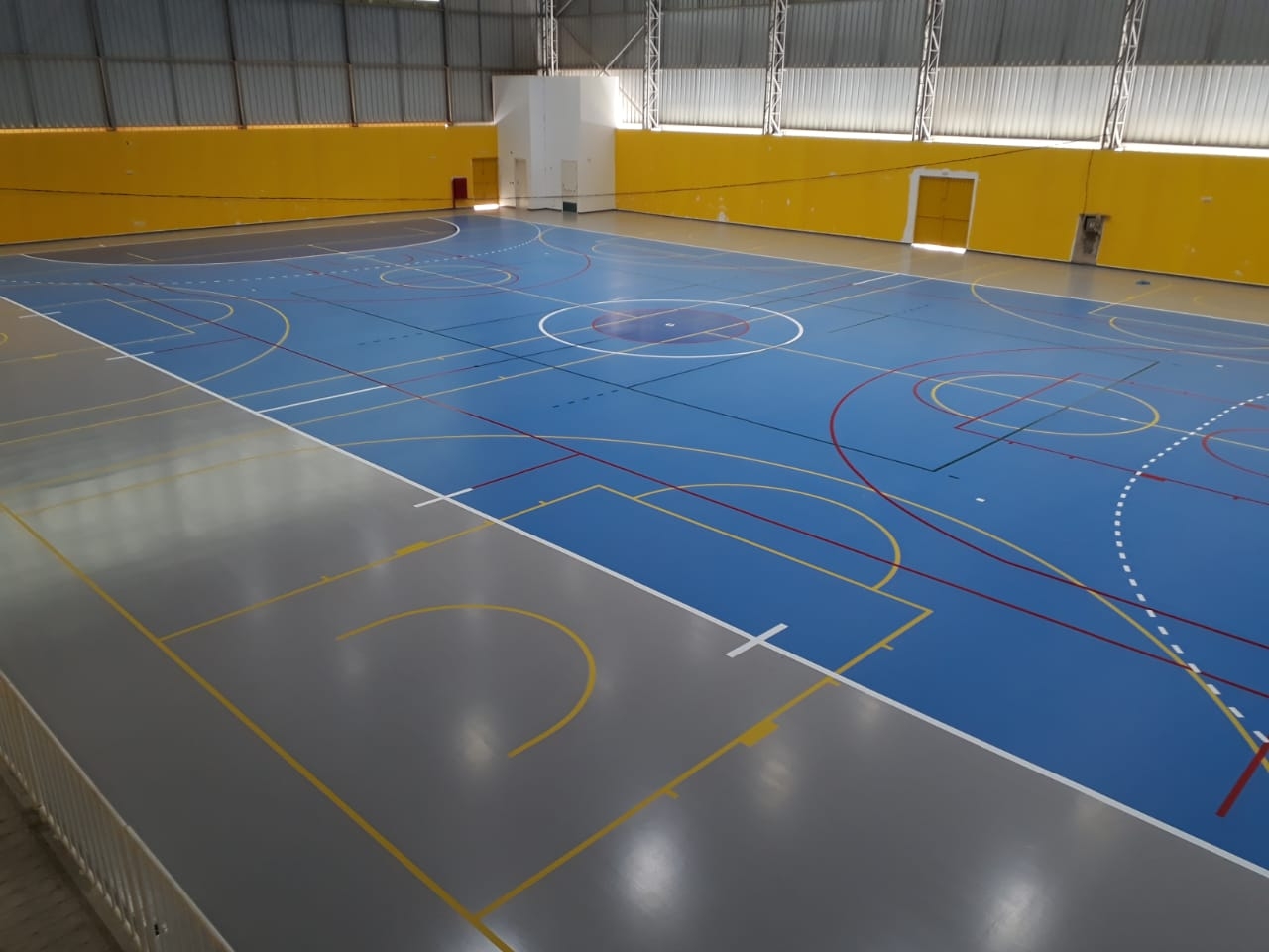 Além das quadras poliesportivas, piso sintético flexível, com camada de resina de poliuretano auto nivelante, com acabamento final tinta PU biocomponente anti-reflexiva.